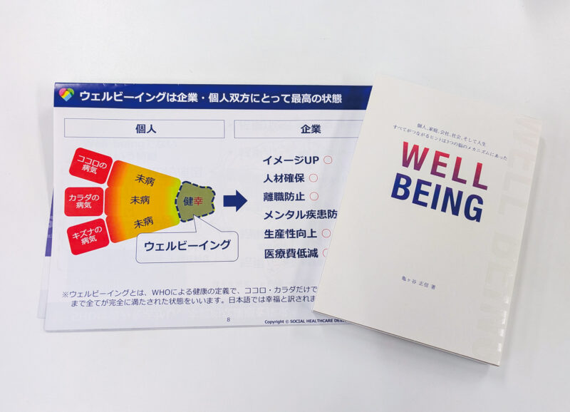 「ウェルビーイング」という言葉があります。これは、WHO(世界保健機関)の定義では、「健康とは、病気ではないとか、弱っていないということではなく、肉体的にも、精神的にも、そして社会的にも、すべてが満たされた状態」(公益社団法人日本WHO協会)のこと。当社はウェルビーイングの安定的確保こそがこれからの戦略と考え、体が健康なだけでなく毎日が幸福であることを掛け合わせ、ウェルビーイングを「健幸」と翻訳しています。そして健幸を目指した経営支援プログラムを開発・提供しています。